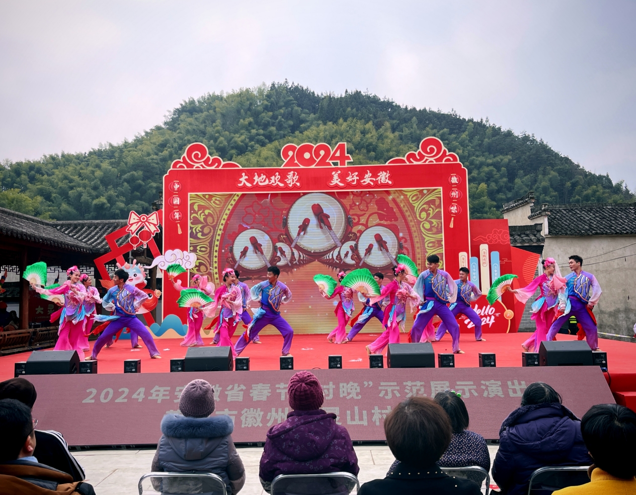 此次演出以“大地欢歌 美好安徽”为主题,展示了当地民俗风情和文化特色,为当地村民和游客献上了一场热闹的徽州文化盛宴。现场欢声笑语,掌声不断,热闹非凡。省歌舞剧院助演的节目舞蹈《花鼓欢庆》以欢快的节奏、活泼的舞步,传达出人们对幸福美好生活的向往;歌曲《春风十万里》以“春风”为载体,表达了对新时代中国发展的赞美和对中国梦的颂扬……此次活动是安徽省“我们的节日——欢欢喜喜过大年”重点活动之一。