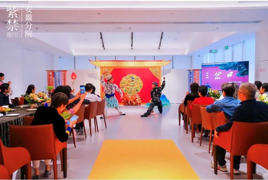 10月5日,紫禁书院·安徽分院上演梨园时刻,国粹戏曲巡游书院与游人互动,更有金秋戏曲文化雅集在大波浪艺术中心圆满举行。本次雅集由紫禁书院·安徽分院、安徽省徽京剧院、安徽省黄梅戏剧院联合呈现,来自文化界、商务界的诸多雅士共同参与,京腔徽韵,声色动人。