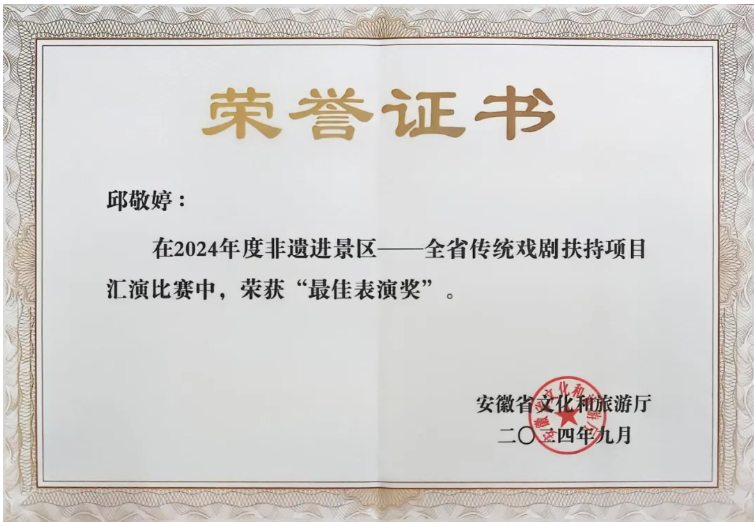 省徽京剧院在本次比赛中摘得多项荣誉,分别是省徽京剧院获“优秀组织奖”、徽剧《借扇》获“最佳传承奖”、青年演员邱敬婷获“最佳表演奖”。(省徽京剧院供稿)