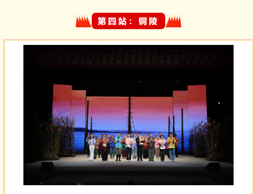 为深入学习贯彻习近平总书记考察安徽重要讲话精神,推动习近平生态文明思想入脑入心,由安徽演艺集团和马鞍山市委宣传部共同出品,安徽省黄梅戏剧院携手马鞍山市艺术剧院联合创排的大型现代黄梅戏《碧水东流》于12月初开启省内七地市巡演,本次巡演以情景党课形式开展。