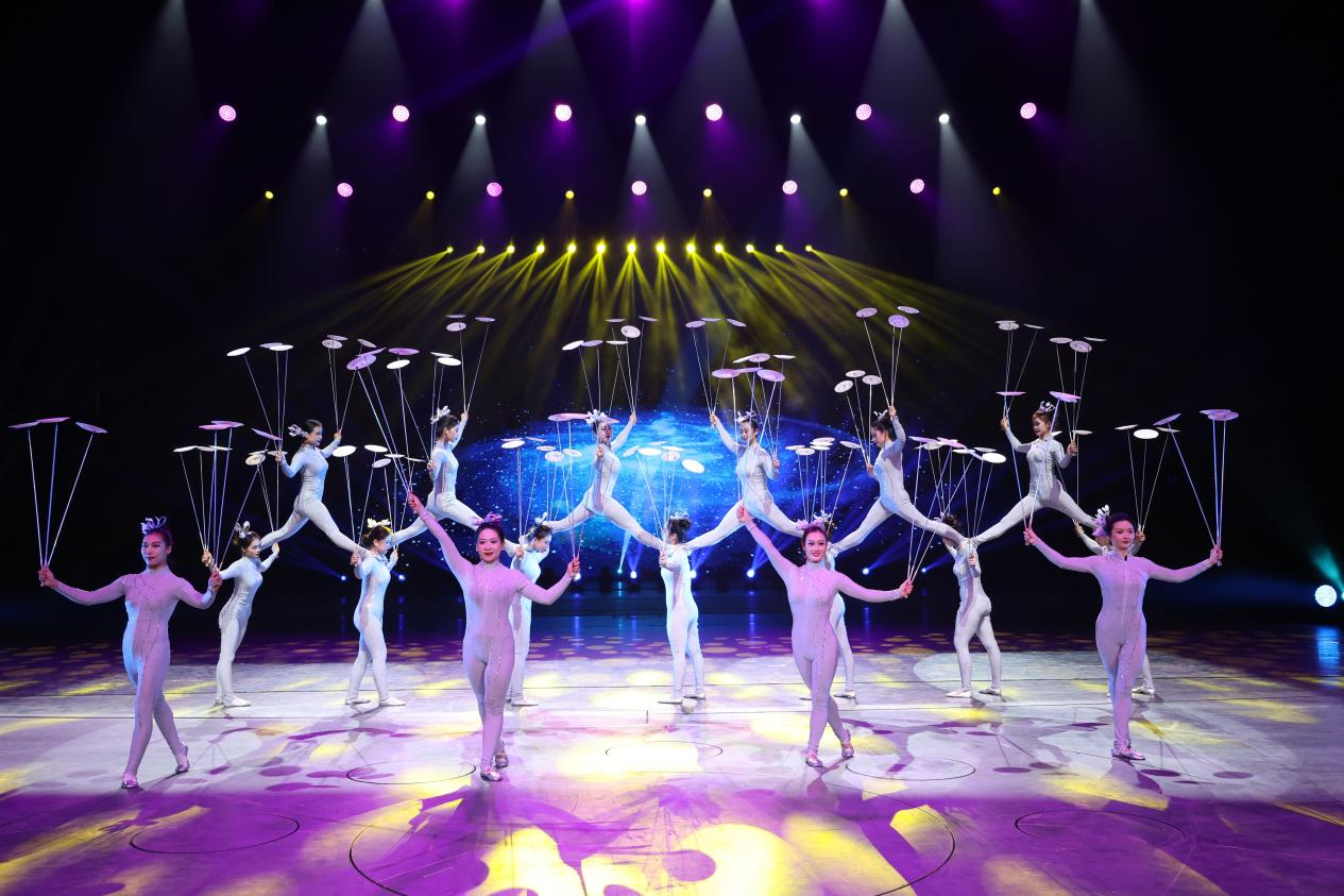 演出中,高难度的空中飞人、柔术、平衡术等经典杂技项目轮番登场,配合绚丽的灯光、音效及多媒体视觉效果,令观众目不暇接。其中,在《旋倒立》环节,小演员在旋转圆盘上完成各种高难度动作,配合灯光投影,营造出身入梦境的奇幻效果,而《绸吊顶技》则通过光影跟随,让演员的每一个动作都在空中留下绚丽的光影轨迹。最终,节目《飞轮》以极致的平衡技巧与惊险的舞台设计,将现场气氛推向高潮,赢得满堂喝彩。