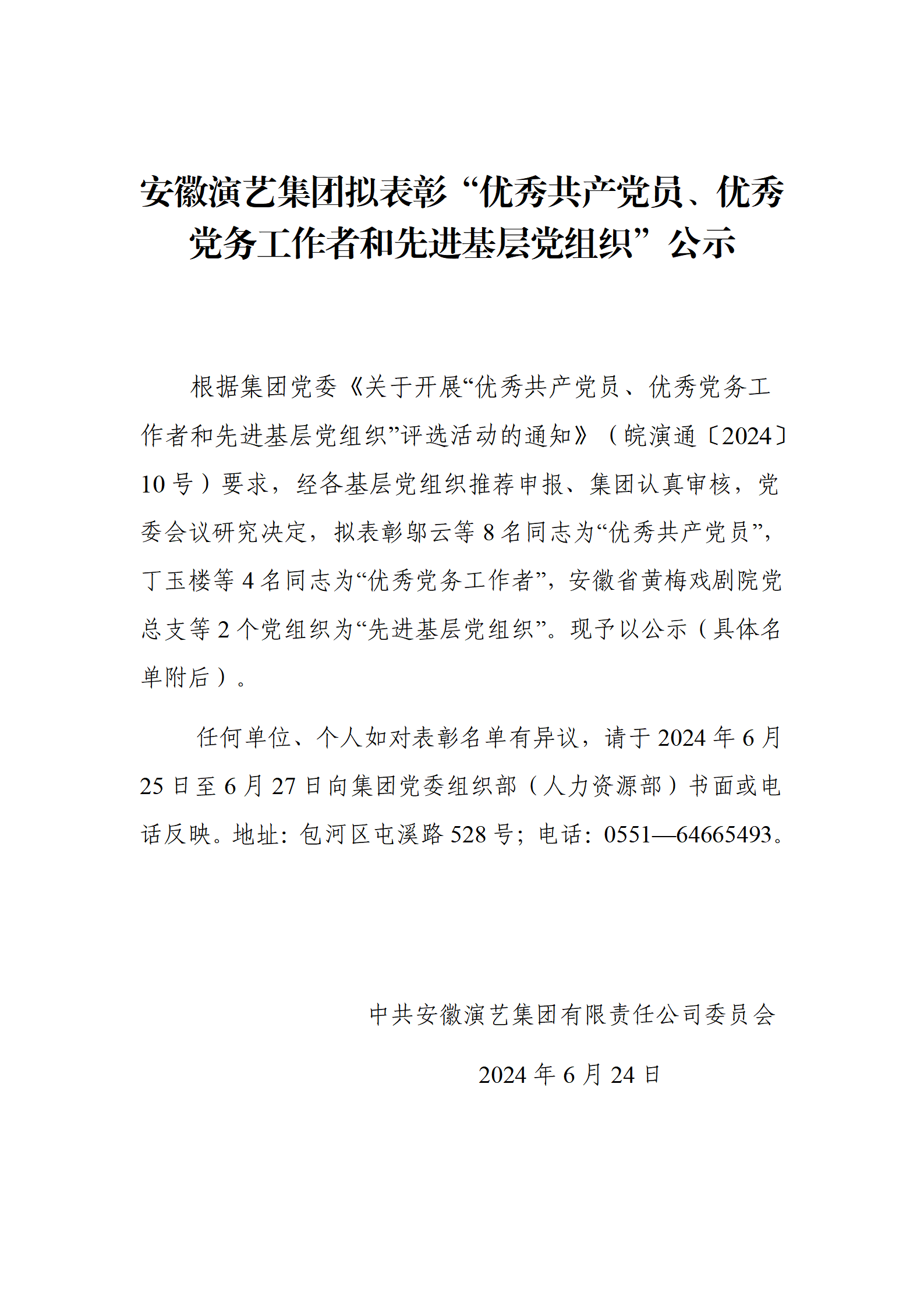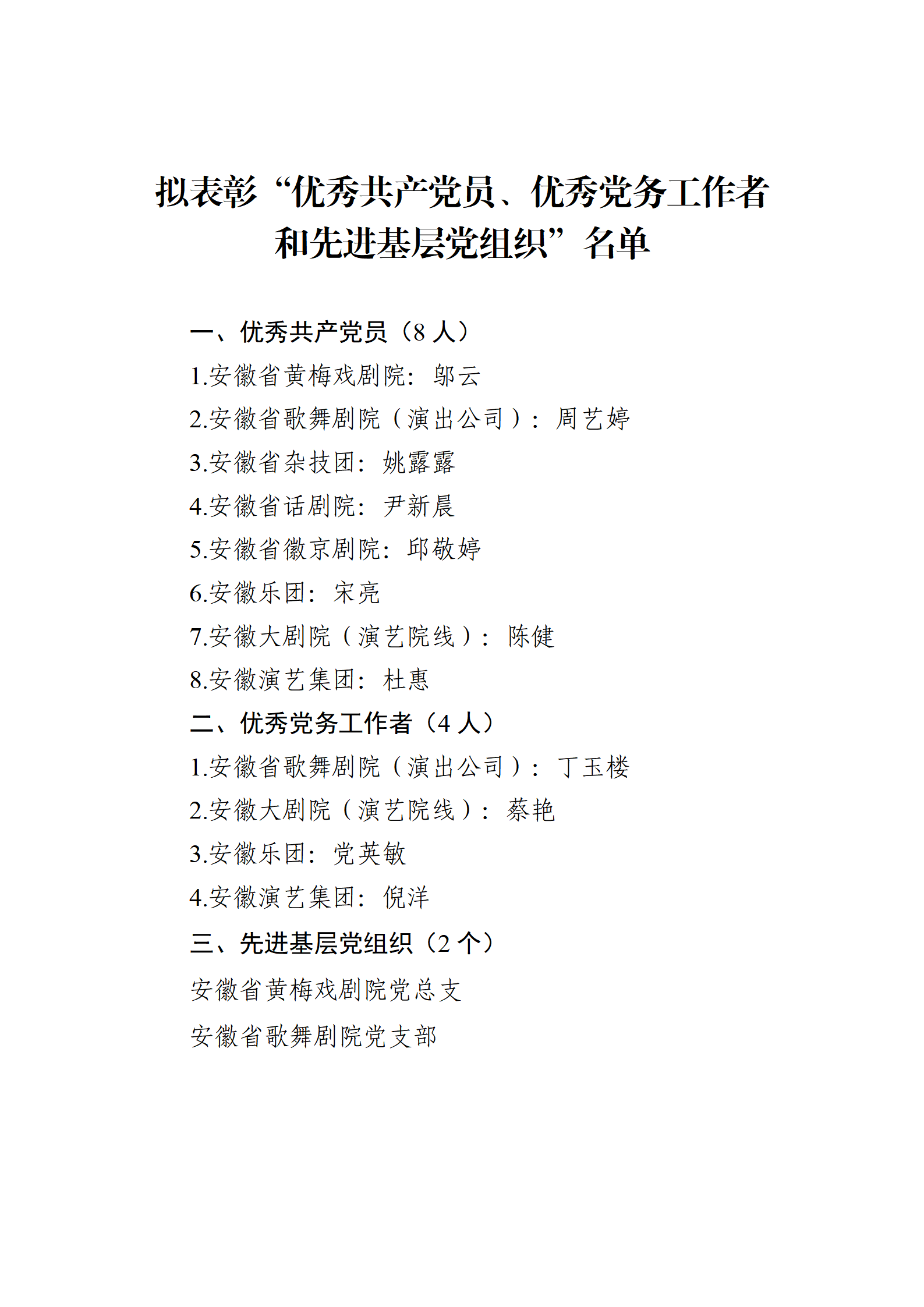 安徽演艺集团拟表彰“优秀共产党员、优秀党务工作者和先进基层党组织”公示