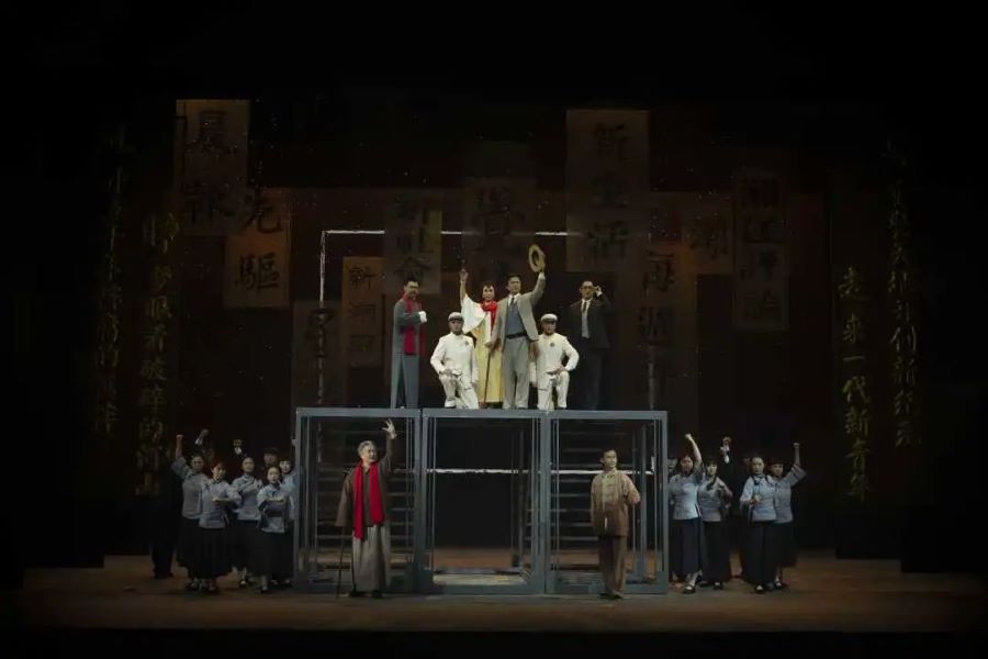 大幕打开,一组“五四运动”的雕像庄严而辉煌。老年陈独秀凝视着雕像,心潮翻涌,进而引发了当年波诡云谲的情景呈现和他的跌宕起伏的人生感慨。