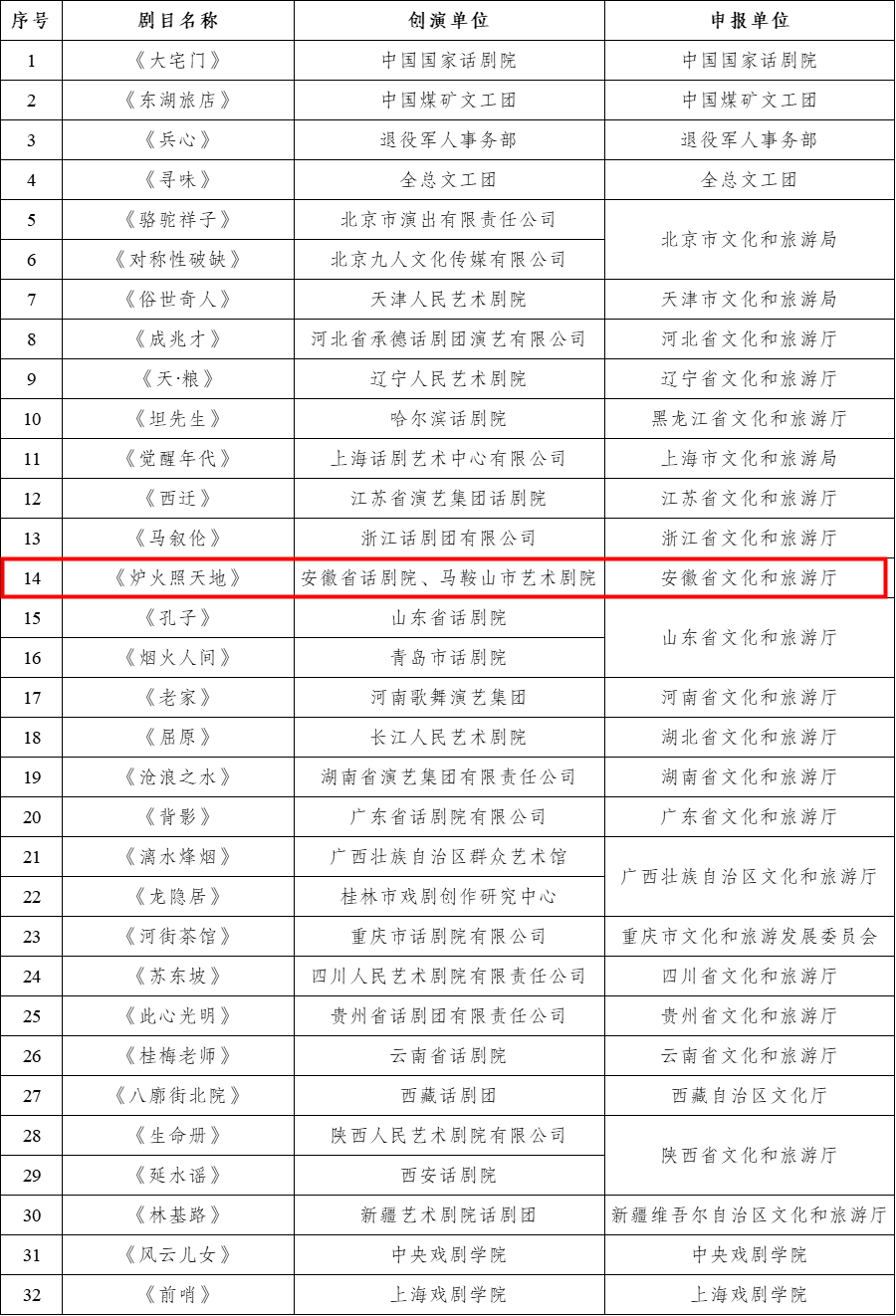近日,文化和旅游部艺术司发布了关于纪念西南剧展80周年暨第八届全国话剧优秀剧目展演入选名单,由安徽省文化和旅游厅申报的剧目《炉火照天地》成功入选。