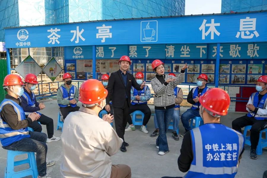 11月2日下午,在中铁上海局三公司创智天地项目部工地,党的二十大代表、国家一级演员,新一代黄梅戏艺术传承人,安徽省黄梅戏剧院的袁媛在为工人们表演经典的黄梅戏片段。