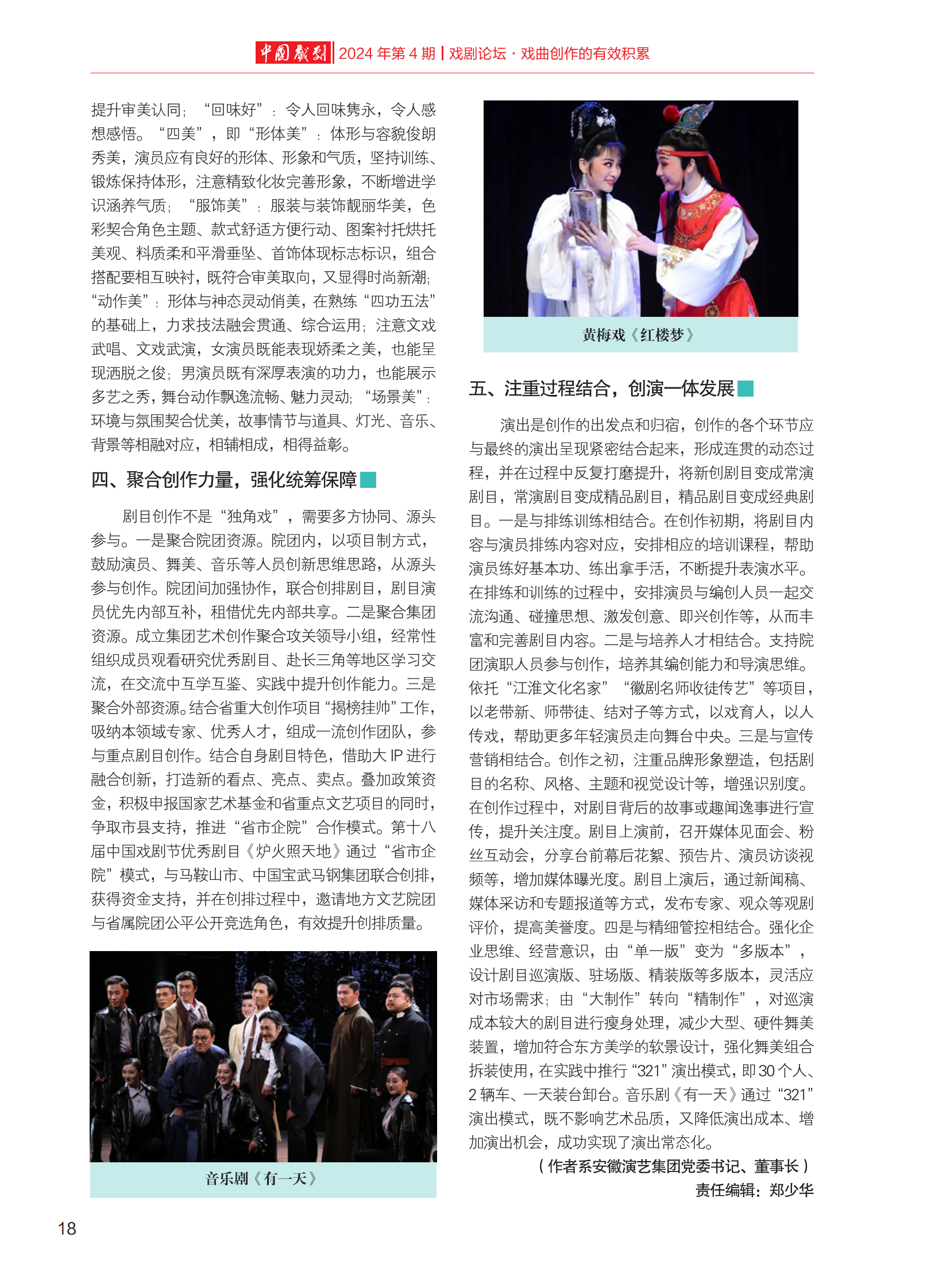 编者按:1月19日,中国剧协分党组书记、驻会副主席陈涌泉在省黄梅戏剧院调研座谈时,听取张健董事长关于艺术创作工作汇报后,对集团抓艺术创作的工作思路和做法举措给予充分肯定,现场要求尽快形成文稿,以便在相关杂志刊登分享。近日,《中国戏剧》2024年第4期以《聚合创作资源 铸造演艺精品——提升剧目创作质效的实践与思考》为题进行刊发,现予以转载,供学习参考。