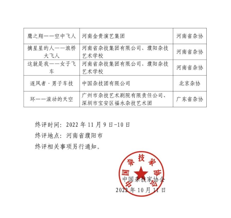 中国杂技金菊奖,是由中国文联参与主办的全国性文艺专业奖项,是中国杂技界的最高奖项。第十一届中国杂技金菊奖将于2022年11月9-10日在河南濮阳市举行终评演出。