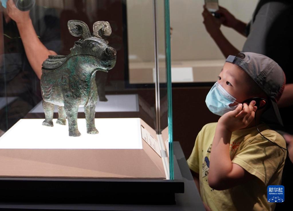 小朋友在上海博物馆举行的“宅兹中国——河南夏商周三代文明展”上参观(2022年7月30日摄)。新华社记者 任珑 摄