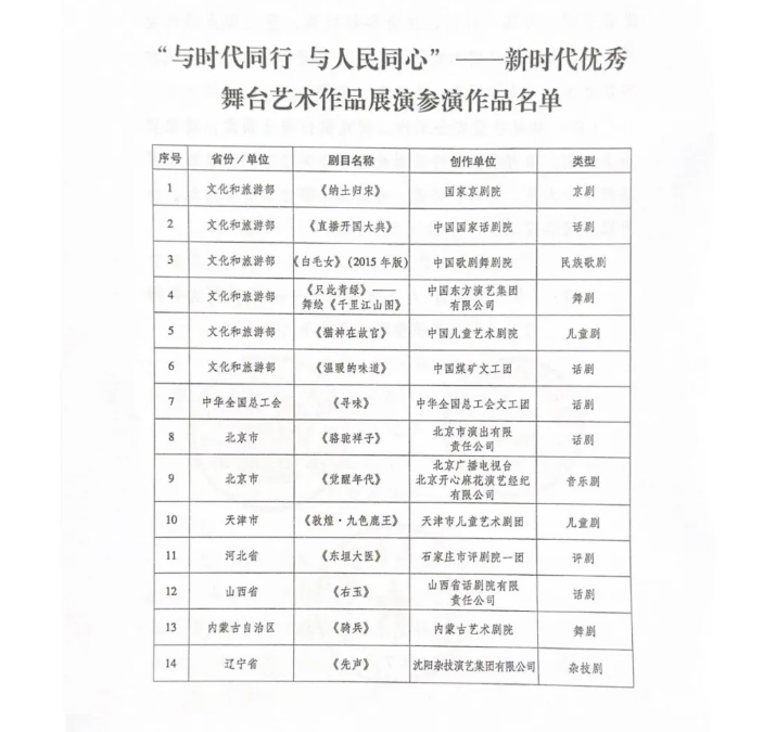 据悉,为热烈庆祝中华人民共和国成立75周年,营造浓厚的节日氛围,同时激励和鼓舞广大文艺工作者和人民群众更加紧密地团结在党中央周围,为全面推进文化强国建设、以中国式现代化全面推进中华民族伟大复兴贡献智慧和力量,中宣部、国家文化和旅游部、中国文联共同策划了“与时代同行 与人民同心”——新时代优秀舞台艺术作品展演活动。