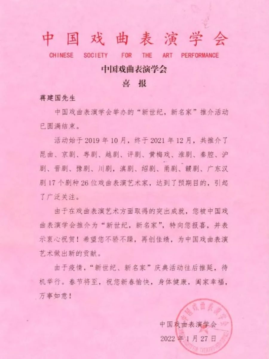 近日,中国戏曲表演学会发来喜报,安徽演艺集团党委委员、副总经理、安徽省黄梅戏剧院院长蒋建国在戏曲表演方面取得突出成就,被推介为“新世纪,新名家”。由中国戏曲表演学会举办的“新世纪,新名家”推介活动,始于2019年10月,至2021年底结束。共推介京剧、昆曲、黄梅戏、越剧、豫剧、秦腔等17个剧种26位戏曲表演艺术家为“新世纪,新名家”。