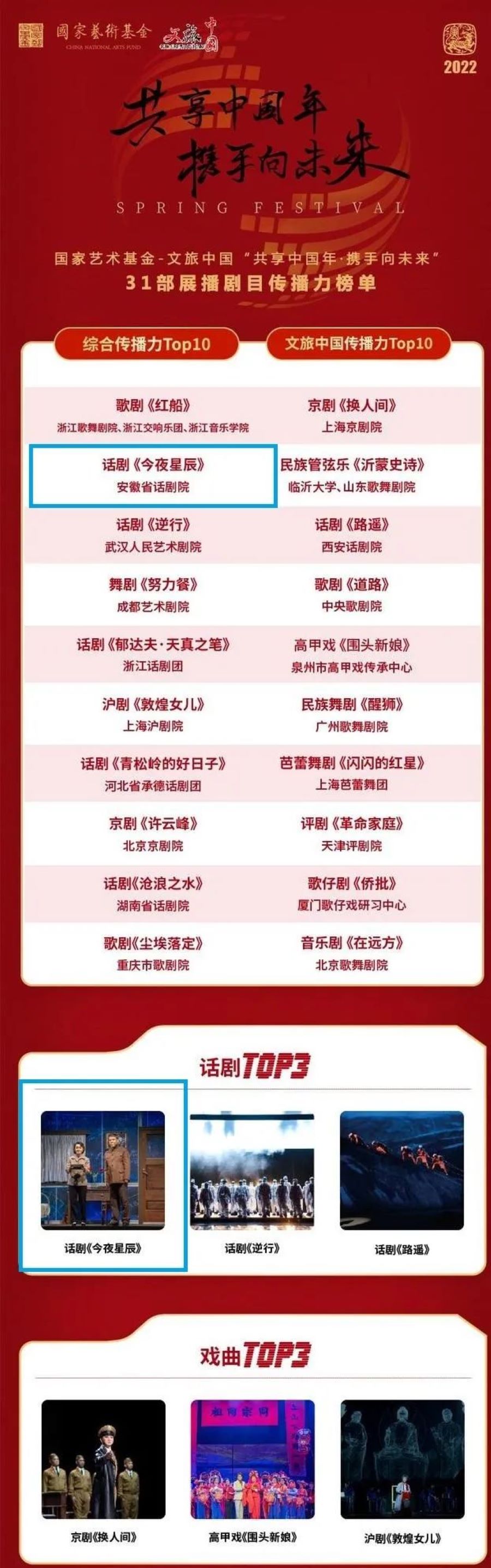 近日,国家艺术基金——文旅中国31部春节展播剧目传播力榜单揭晓,由安徽省话剧院创排的话剧《今夜星辰》荣获本次活动传播力榜单综合榜第二、话剧类榜首。