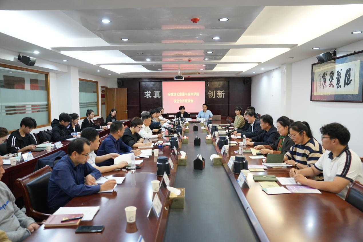 座谈会上,张健介绍了集团的基本情况,并对李红书记一行来访表示热烈欢迎。他说,近年来集团聚焦主责主业,坚持以创作为核心任务,以演出为中心环节,深入挖掘安徽优秀文化,在出人出戏出效益方面取得积极成效。张健表示,双方在剧目创排、人才培养、活动共建等方面合作具有广阔前景。本次签订校企合作协议是集团与宿州学院开启深化合作关系、建立长效互信机制的全新篇章,也是双方推动社会人才高质量发展的具体行动。下一步,希望双方就“人才培育、剧目创作、演出交流”等方面加强务实合作,优势互补、各展所长,推动有关合作落地、落细、落实。