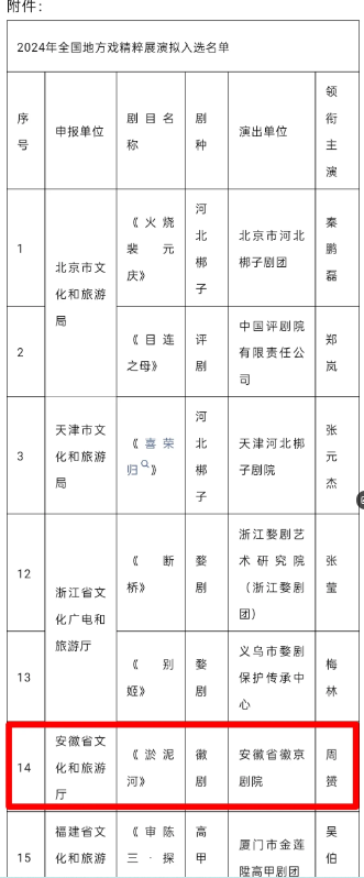 近日,文化和旅游部艺术司公示了2024年全国地方戏精粹展演拟入选名单,由省文化和旅游厅申报的徽剧《淤泥河》成功入选。