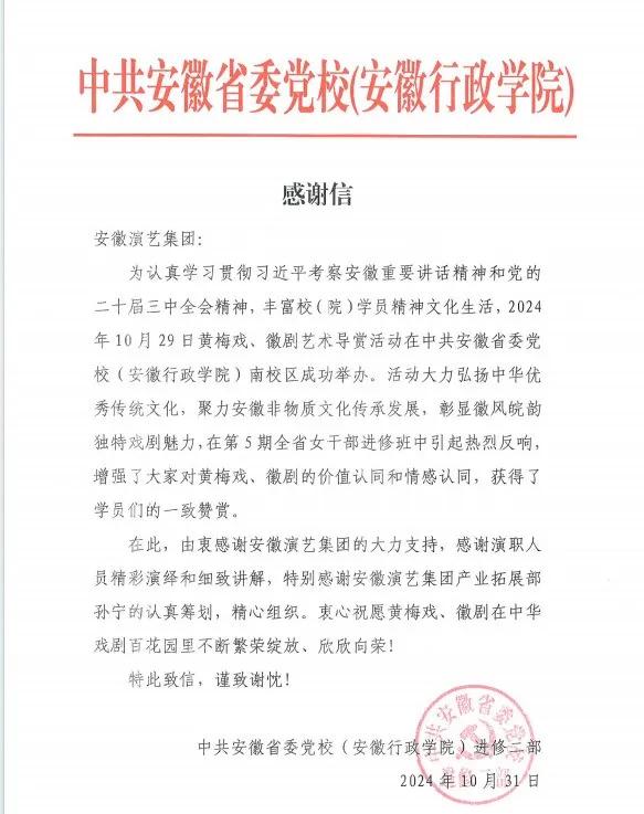 近日,安徽省委党校(安徽行政学院)给集团发来感谢信,由衷感谢集团于10月29日在省委党校南区举办的一场黄梅戏、徽剧艺术导赏活动。信中指出,活动大力弘扬了中华优秀传统文化,聚力安徽非物质文化传承发展,彰显了徽风皖韵独特戏剧魅力,在第5期全省女干部进修班中引起热烈反响,增强了大家对黄梅戏、徽剧的价值认同和情感认同,获得学员们一致赞誉。