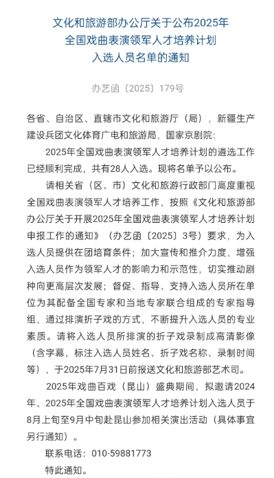 据悉,全国戏曲表演领军人才是文化和旅游部为加强戏曲表演人才队伍建设,培育推出一批中青年戏曲表演领军人才,在“十四五”时期组织实施的人才培养计划。