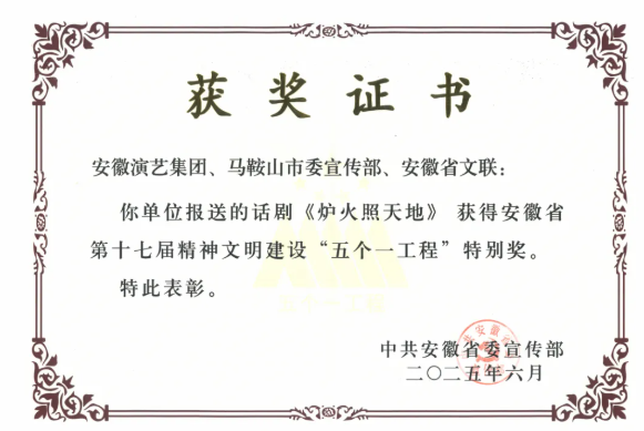 近日,省委宣传部印发表彰决定,对安徽省第十七届精神文明建设“五个一工程”组织工作先进单位和优秀作品进行表彰,集团荣获“组织工作奖”。由集团联合申报的话剧《炉火照天地》荣获“特别奖”,组织申报的民族歌剧《风雪大别山》、黄梅戏《百鸟朝凤》荣获“优秀作品奖”。
